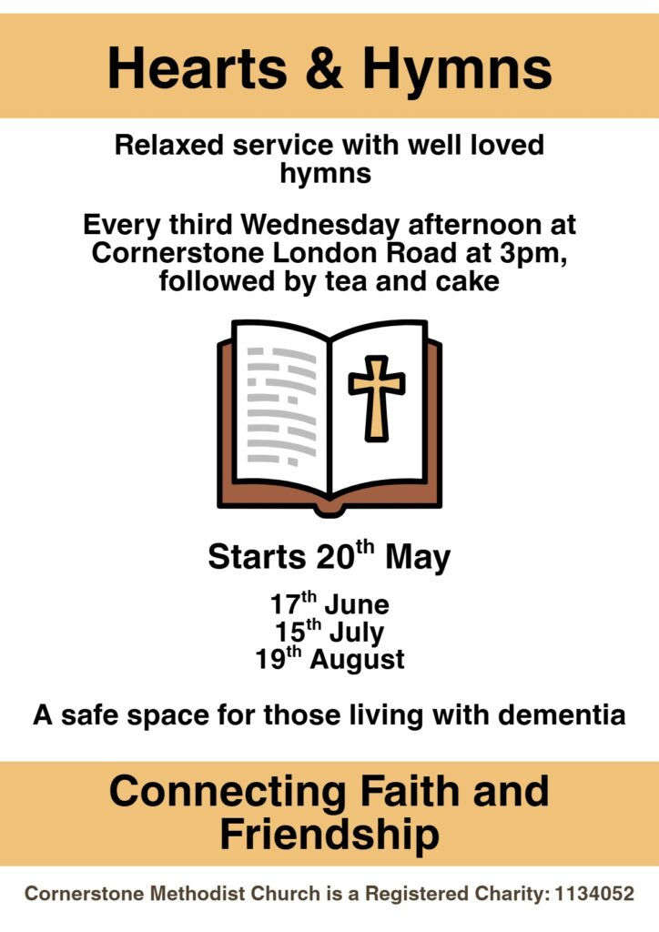 Cornerstone Methodist Church, Horsham, are keen to promote a monthly midweek service that will be particularly accessible for those living with dementia, but also more generally for anyone who struggles to get to a Sunday 10.30am service.